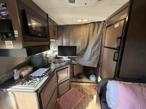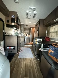 Pet Supplies: I brought one bag of essential pet supplies. I just put it all in a large cooler bag, and that took up a lot of space on the counter. This carried their wet food, treats, bowls, etc. I brought a smaller bag of dry food and was able to store that in one of the cabinets. I knew I was getting a kitten prior and packed some supplies, which I kept in the under-RV storage. Speaking of under-RV storage, there is a lot! So you can pack chairs, a grill, or whatever extra stuff you may need. One last tip: Talk to your vet about getting some diarrhea antibiotics so you can take them on the trip for your dogs. Their stomachs get upset with change too. It doesn’t mean they are sick, but even when we are having the most fun, the change can be enough to wreck our guts. So this was a lifesaver for our journey. Hint hint… this is also a lifesaver when boarding your dogs. I also packed it for the rest of my crew who are boarding at BHV.