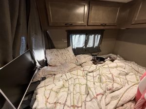 For our movie choices, we tried to watch Sling Blade. For some reason, Amazon was being sticky, so we ended up renting the movie Mud. Both of these were filmed in Arkansas. Paul fell asleep, so I took Mud to my “room,” pulled the curtain, and finished watching. I am going to miss this fort-like feel of a bed. Paul would sleep in the dinette fold-out, and I got the bed with the dogs and kitten. I did have to sleep backwards and diagonal, but this is making me question my bedroom setup at home. How do I get a curtain on tracks to enclose my entire bed?